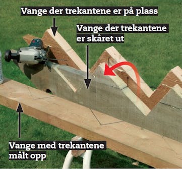 Som du ser på tegningen i begynnelsen av artikkelen, skjærer vi kun halvdelen av dette trinnet ut av vangen. Deretter snur vi den avskårne trekanten, og setter den fast med lim og skruer på vangens overside, slik at vi ender opp med et trinn med full størrelse.