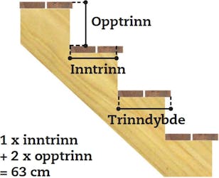 Den klassiske matematiske formelen for trapper tar utgangspunkt i et skritt på flat bakke på 63 cm. Formelen lyder 1 x inntrinn + 2 x opptrinn = 63 cm.