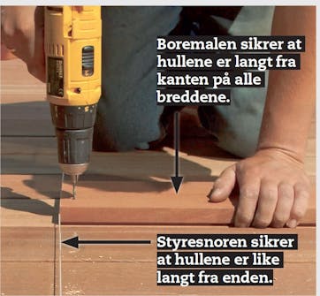 Skruehullene forbores ved hjelp av en boremal, en bred variant der vi har målt presist opp og boret to hull gjennom og ned i alle bordene. Hullene styres inn på linje av en styresnor.