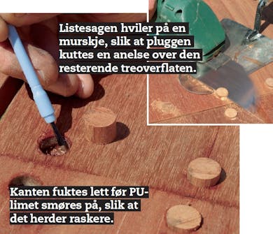 Vi skjærer pluggen ut av en rundstokk i teak, slik at det vil stå dekorativt til det mørke treet. Det er ikke helt optimalt, men teak suger til seg så lite vann at vi sparer både den tiden og de pengene det vil koste å bore dem ut av en teakplanke.