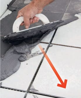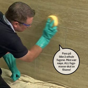 Trekk på fugemassen med et fugebrett. Sørg for å få massen presset godt ned i alle fugene - snu og vri fugebrettet som det passer. Trekk overskytende fugemasse av flisene med diagonale bevegelser. Da vaskes det av så lite som mulig.
