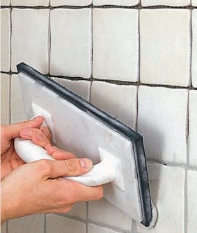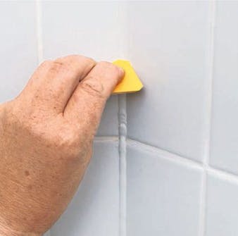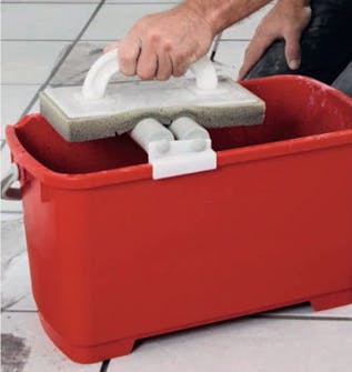Bløtgjør fugesvampen, og trekk av overskytende vann på rullene i spannet, før du vasker over flisene i sirkulære bevegelser.