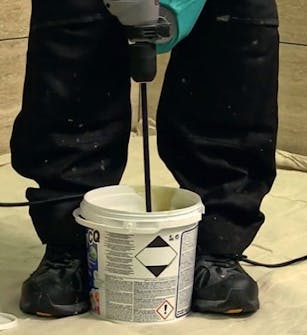 Rør massen sammen i 4-5 minutter med en blandevisp på bormaskinen. Konsistensen er litt tykkere enn den sementbaserte fugemassen.
