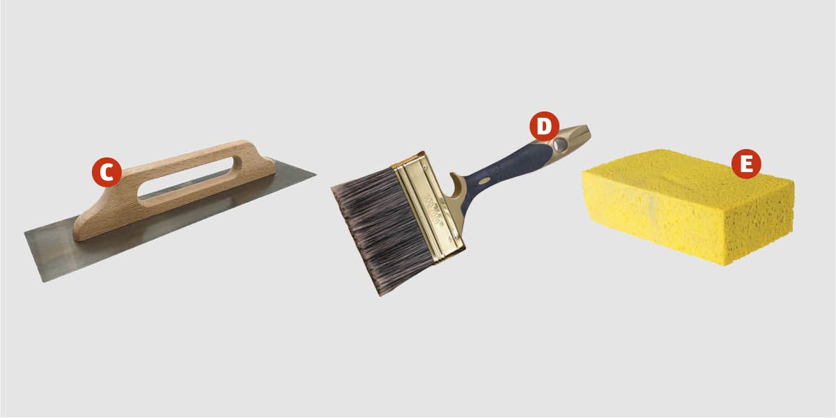 - Blandevisp, stålbrett, gummibrett, tannsparkel (4 mm tenner) og svamp