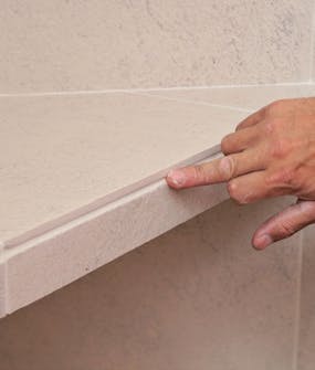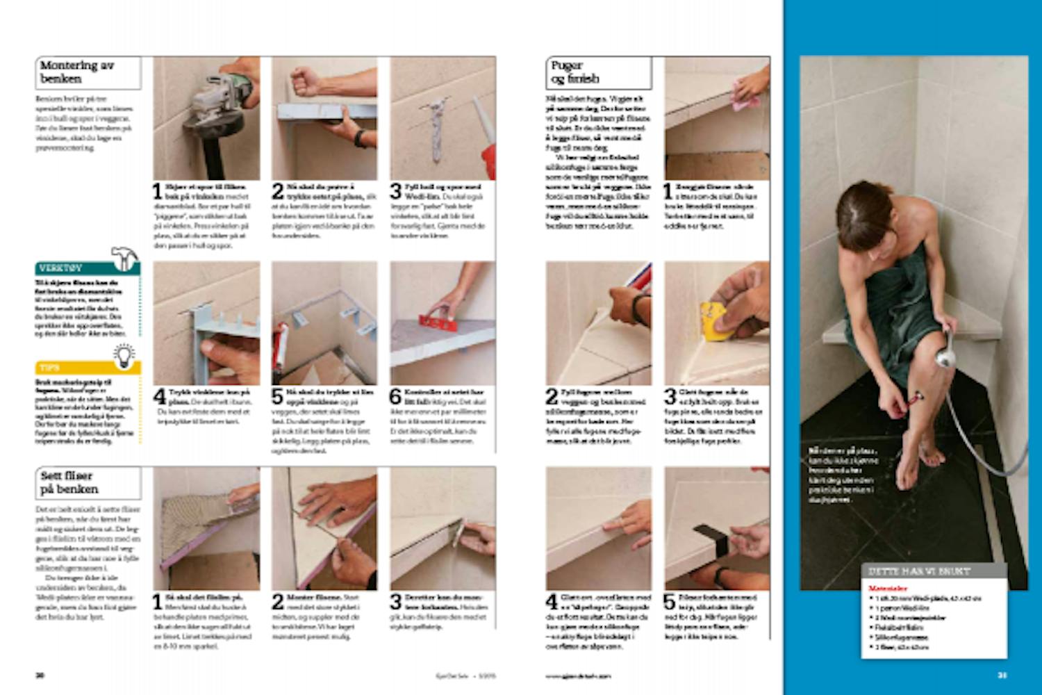 Det er helt enkelt å sette fliser på benken, når du først har målt og skåret dem ut. De legges i flislim til våtrom med en fugebreddes avstand til veggene, slik at du har noe å fylle silikonfugemassen i.