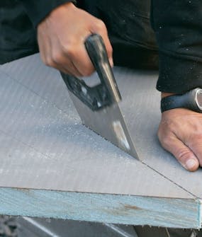 Sag ut Wedi-platen med en utslitt håndsag; den slitte sagen sager fint i platene. Ikke bruk en ny sag, den slites ut med en gang.