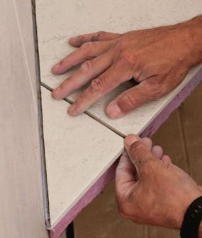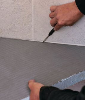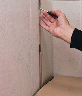 Strek opp langs veggen, hvis platen ikke går helt inntil, og sag den endelig til. Sørg for at snittet er loddrett, slik at limflaten mot veggen blir så stor som mulig.