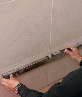 Avsett sittehøyden på veggen med en blyant. Det er enklest å fjerne igen. Trekk fra flistykkelsen og 5 cm setetykkelse. Der skal underkanten av benken være.