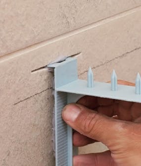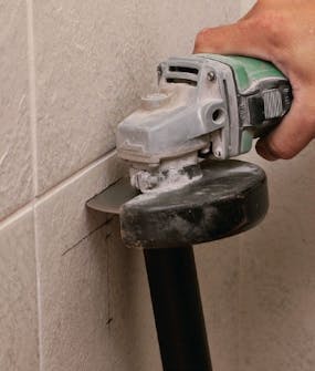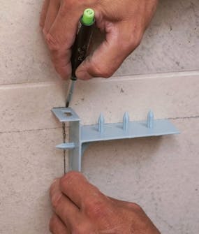 Skjær et spor til fliken bak på vinkelen med et diamantblad. Bor et par hull “piggene”, som stikker ut bak på vinkelen. Press vinkelen på plass, slik at du er sikker på at den passer i hull og spor.