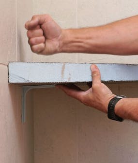 Nå skal du trykke ut lim oppå vinklene og på veggen, der setet skal limes fast. Du skal sørge for å legge på nok til at hele flaten blir limt skikkelig. Legg platen på plass, og klem den fast.