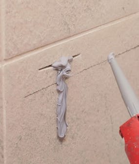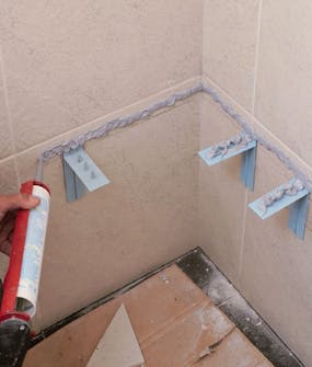 Fyll hull og spor med Wedi-lim. Du skal også legge en “pølse” bak hele vinkelen, slik at alt blir limt forsvarlig fast. Gjenta med de to andre vinklene.