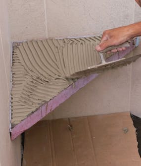 Så skal det flislim på. Men først skal du huske å behandle platen med primer, slik at den ikke suger all fukt ut av limet. Limet trekkes på med en 8-10 mm sparkel.