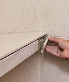Fyll fugene mellom veggen og benken med silikonfugemasse, som er beregnet for baderom. Her fyller vi alle fugene med fugemasse, slik at det blir jevnt.