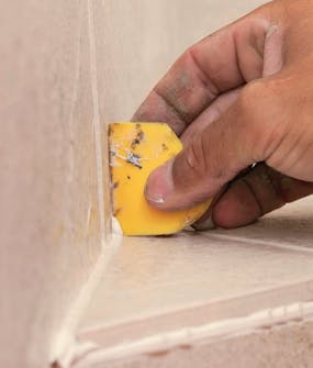 Glatt fugene når de er fylt helt opp. Bruk en fugepinne, eller enda bedre en fugekloss som den du ser på bildet. De fås i sett med fjere forskjellige fugeprof ler.