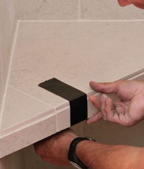 Nå skal det fuges. Vi gjør alt på samme dag. Derfor setter vi teip på forkanten på flisene til slutt. Er du ikke vant med å legge fliser, så vent med å fuge til neste dag.