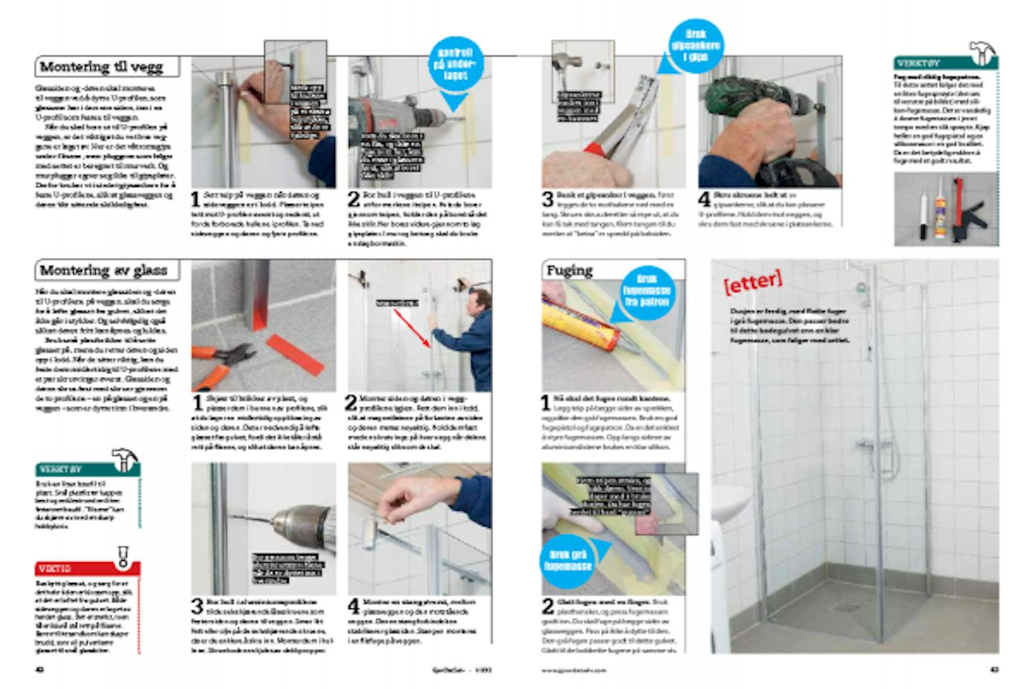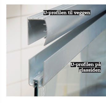 Glassiden og -døren skal monteres til veggen ved å dytte U-profilen, som glassene har i den ene siden, inn i en U-profil som festes til veggen.