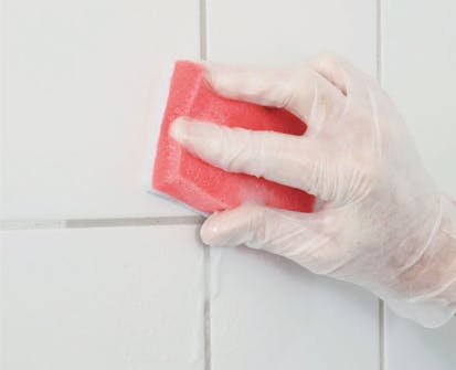 Rengjør veggen. Det er viktig å fjerne alle såpe- og fettrester fra flisene på vegg og gulv. Ellers hefter ikke fugemassen ordentlig. Lag en konsentrert blanding av vann og grunnrens, og gni flisene godt med en skuresvamp. Vask etter med vann.