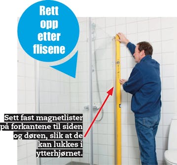 Lag en prøveoppstilling. Legg brikker på gulvet, og sett opp vegg og dør i hjørnet. Rett dem inn, slik at de står i lodd og overkantene flukter. Rett dem også inn etter flismønsteret. Dette står ikke i veiledningen, men resultatet blir penere.