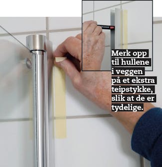 Sett teip på veggen når døren og sideveggen er i lodd. Plasser teipen tett mot U-profilen øverst og nederst, ut for de forborede hullene i profilen. Ta ned sideveggen og døren og fjern profilene.