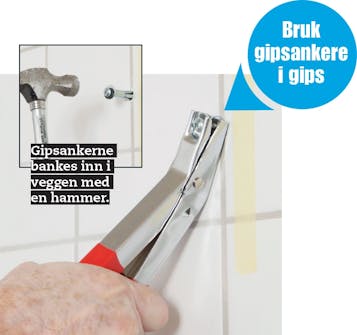 Bank et gipsanker i veggen. Først legges de to mothakene ned med en tang. Skruen skrus deretter så mye ut, at du kan få tak med tangen. Klem tangen til du merker at “beina” er spredd på baksiden.