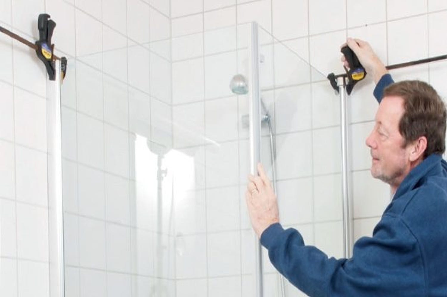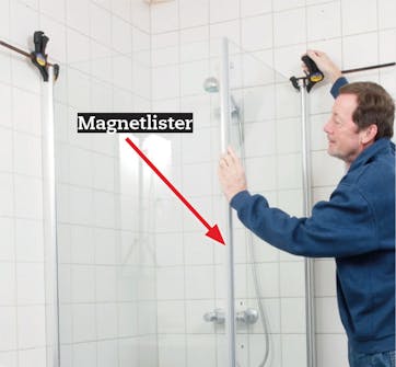 Når du skal montere glassiden og -døren til U-profilene på veggen, skal du sørge for å løfte glasset fra gulvet, slik at det ikke går i stykker. Og selvfølgelig også slik at døren fritt kan åpnes og lukkes.