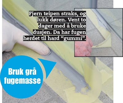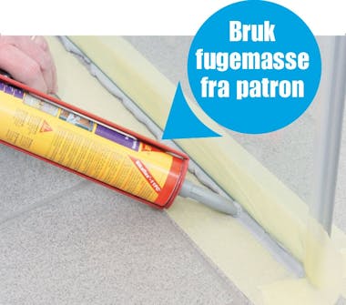 Nå skal det fuges rundt kantene. Legg teip på begge sider av sprekken, og påfør den grå fugemassen. Bruk en god fugepistol og fugepatron. Da er det enklest å styre fugemassen. Opp langs sidene av aluminiumslistene brukes en klar silikon.