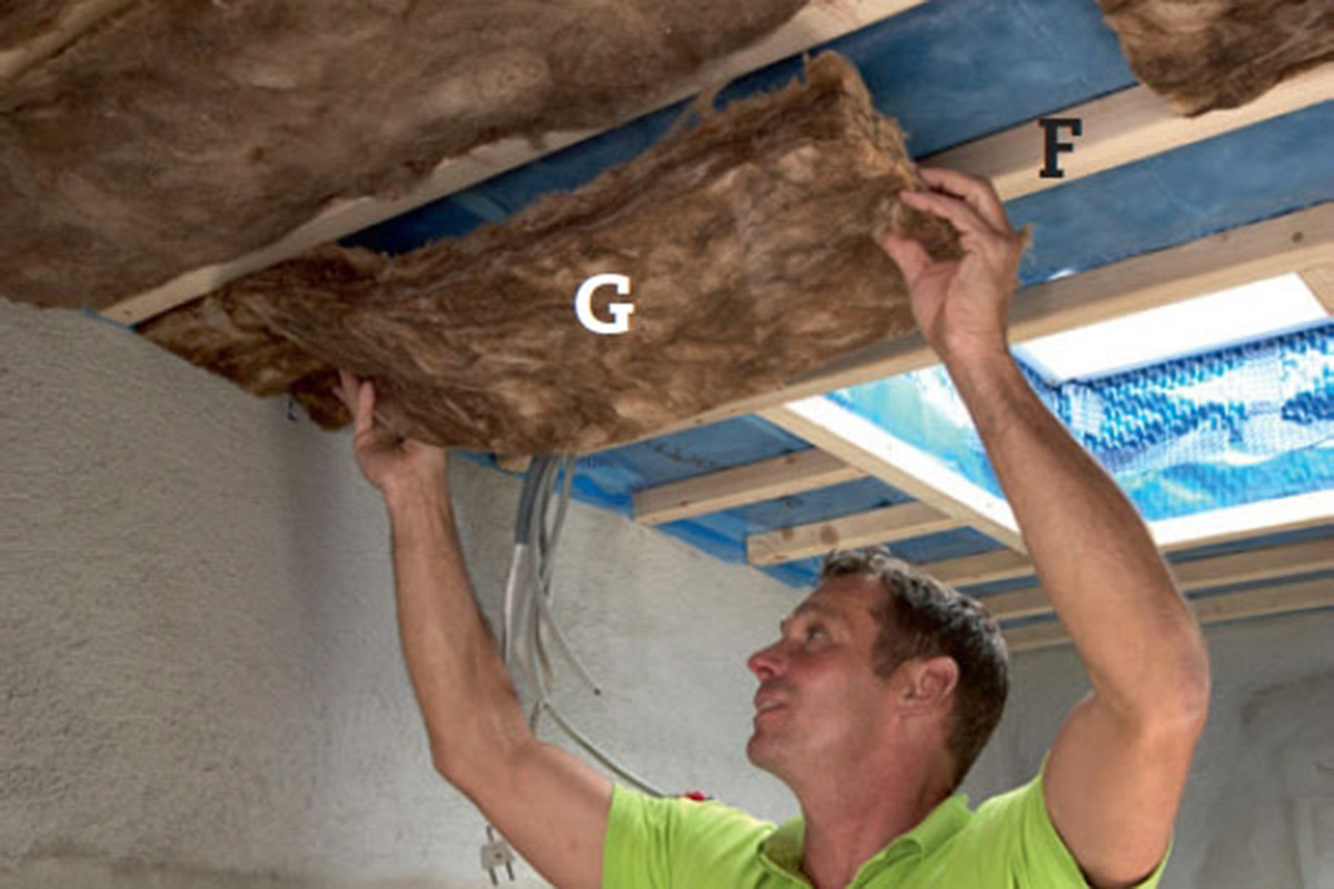 Isolasjonen (G) klemmes på plass mellom listene (F). Vi bruker 45 mm matter med en bredde på 56 cm. Når vi deler dem på midten, passer de stramt mellom lektene.