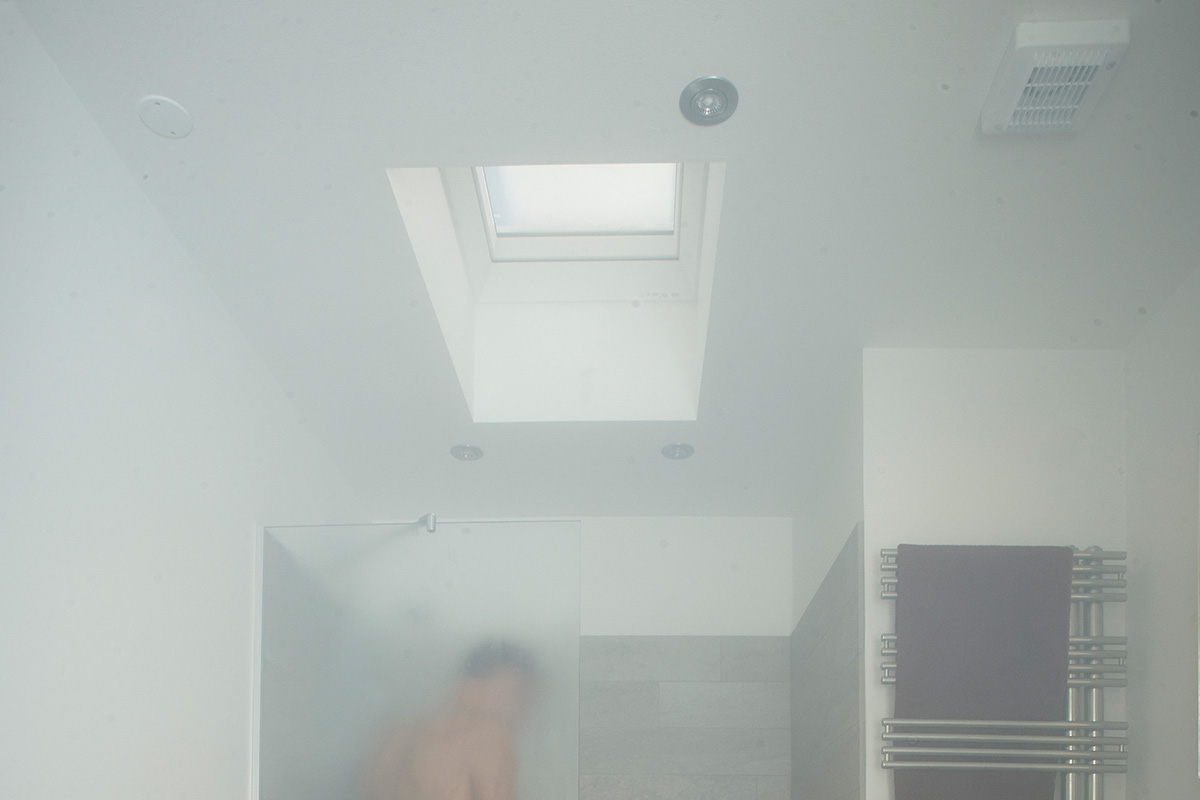 Nå er det tid for å sette plater i sidene på lysåpningen, under takvinduet. Vi begynner med de to langsidene, som føres helt gjennom i lengden. Deretter tilpasser vi kortsidene, slik at de passer inn mellom langsidene.