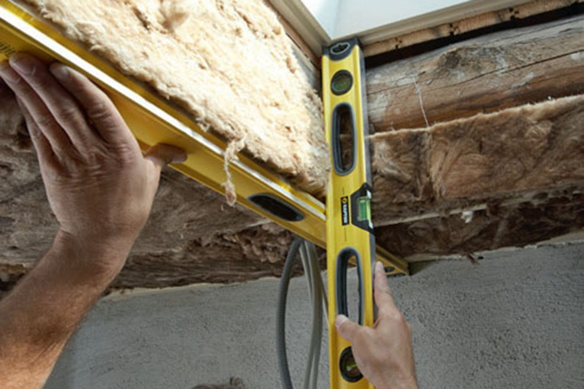 Ved takvinduet sjekker vi plasseringen en ekstra gang, før vi skrur fast lekten. Platene i lysåpningen kan ikke justeres, så listen skal sitte helt loddrett under falsen i karmen.