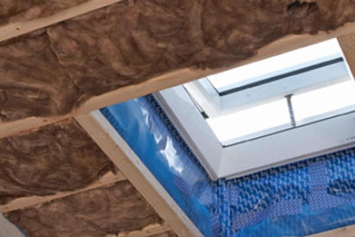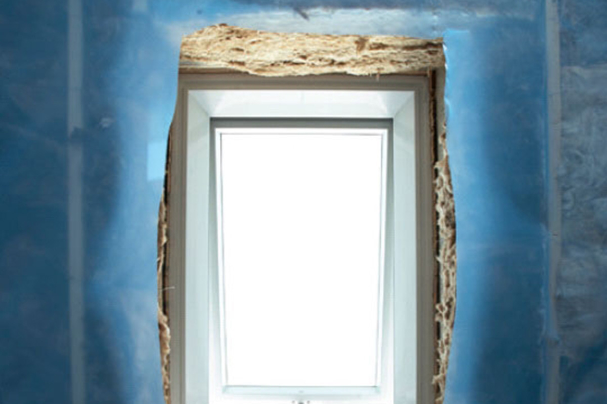 Ved takvinduet skjærer vi ut en firkant i folien, slik at vi kan føre dampsperren opp mot vinduet og tette godt mot karmen. Du kan bruke en smal foliestripe. Her bruker vi lysåpningsfolie med limkant.