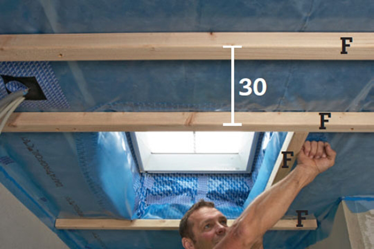 Vi måler loddrett ned fra falsen i takvinduet, der platene i lysåpningen vil bli stukket inn. Nederst skal platene ha støtte og settes sammen med platene i taket. Her plasserer vi derfor en list i begge sider.