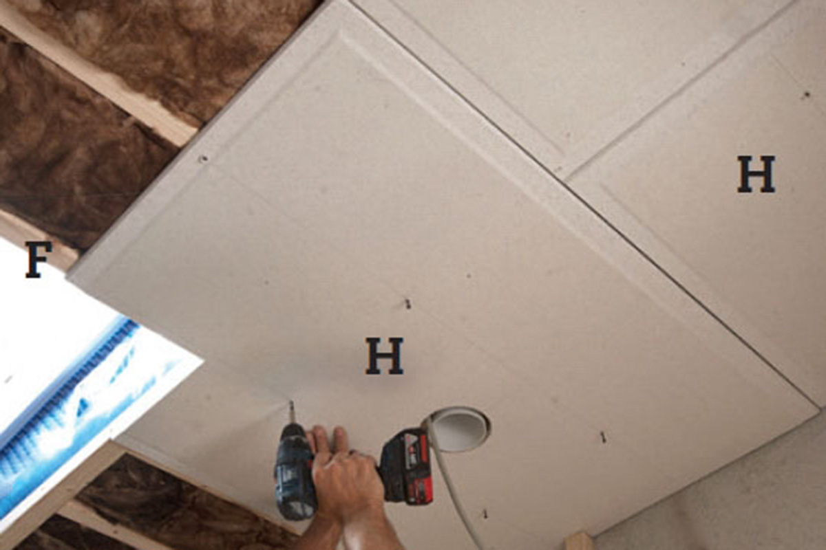 Lektene (F) skrus opp etter merkene på sperrene - de synes godt gjennom den blå plasten. Vi setter én enkelt 5 x 100 mm skrue i hvert kryss.