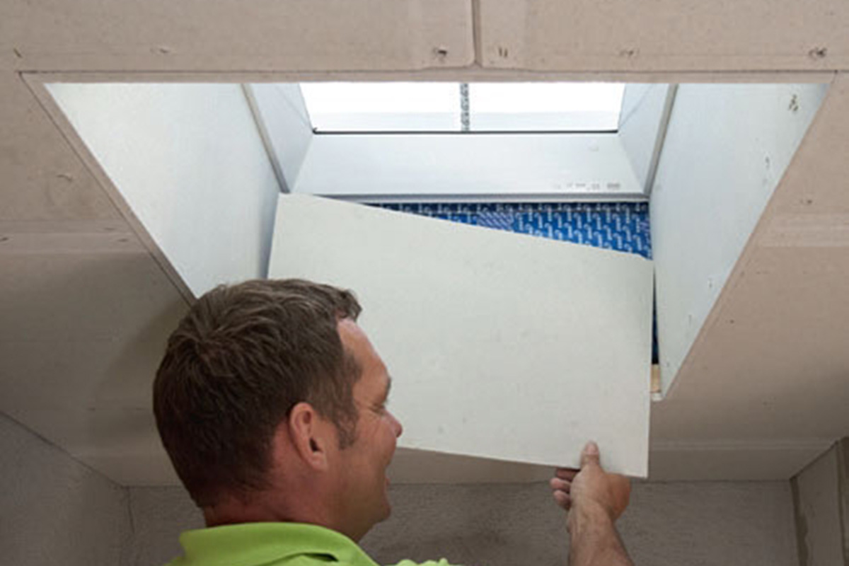 Langsidene i lysåpningen dekkes først. Platen skjæres til, slik at den stikker 1 mm nedenfor platene i taket. Fibergipsen er så hard at vi kan sparkle inn mot den. Platen sitter i falsen og skrus kun nederst.