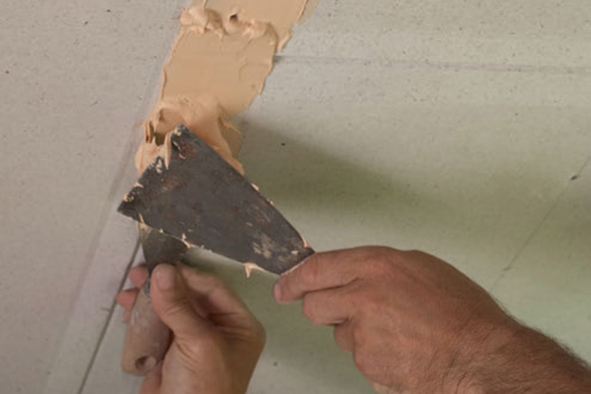 Papirstrimmelen legges i våt sparkelmasse. Sørg for å holde retningen, så strimmelen ikke krøller seg. Husk å tette over alle skruene med sparkelmasse.