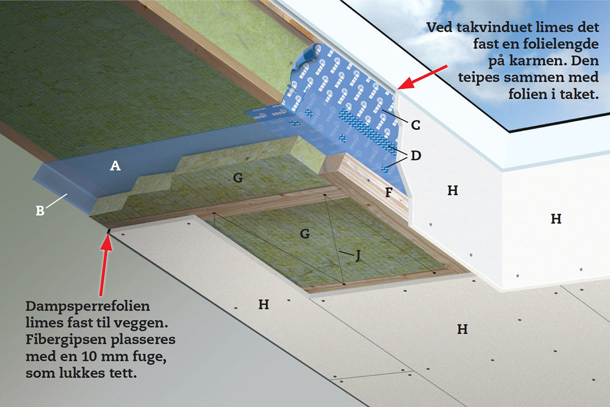 Dampsperrefolien (A) stiftes fast på sperrene. Vi stifter den langs den ene veggen, og strekker den derfra til motsatt vegg midt i rommet. Folien skal henge 4-5 cm ned på alle veggene.
