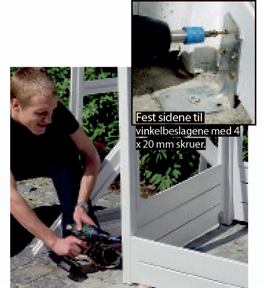 Skru sammen sidene med 5 x 70 mm skruer gjennom hjørnestolpene. Forbor med et 5 mm bor. Det kan være en fordel å ha noen til å holde på plass sidene.
