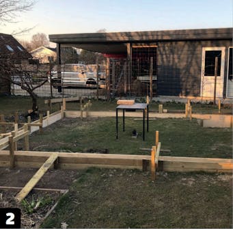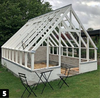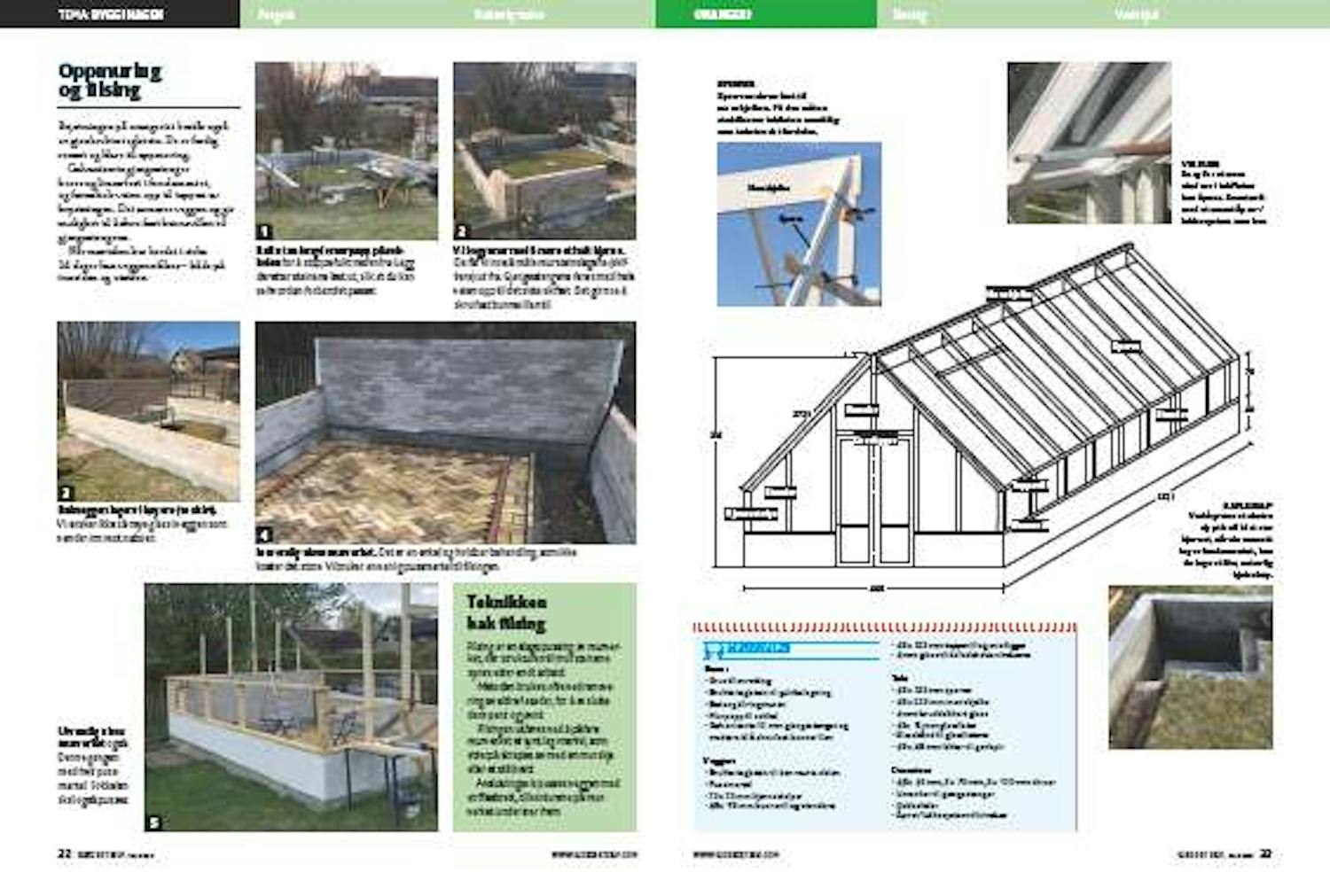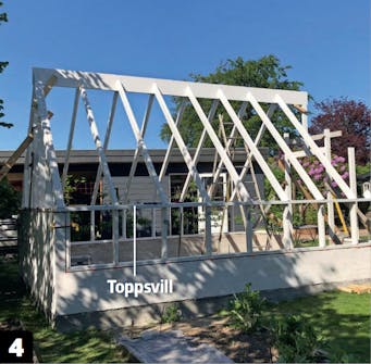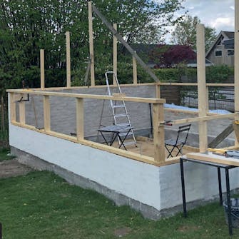 Høyden på toppsvillen er cirka 1,5 meter over bakken. Det passer med høyden på bakveggen. Det er smart å sette sammen reisverket i moduler, før du setter det opp. Da er det enklere å skru sammen.