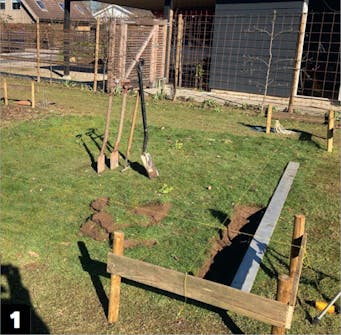 Når ringmuren og sokkelen er tørr, graver vi et ekstra dypt hull i orangeriets ene hjørne. Det skal fungere som et naturlig kjøleskap. Kanten av kjøleskapet mures senere.