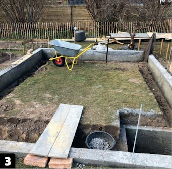 Innvendig skal det graves en renne langs den støpte sokkelen. Det er nødvendig for at vannet fra plantekassene som skal installeres senere kan ledes vekk.