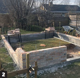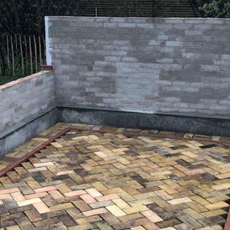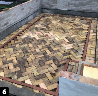 Fundamentet skal herde i cirka 3 uker før du kan bygge oppå det. I mellomtiden kan du lage gulvbelegningen, som her består av gjenbrukte murstein.
