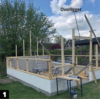 I gavlveggen, der inngangen skal være, monteres det en overligger. Oppå overliggeren settes en loddrett stender som skal bære mønebjelken.