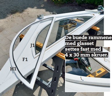 Tegn opp buen i gavlvinduet. Mål først opp på platen (F1) som skal brukes til kledning, og tegn opp buen. Den lages med en list, som settes fast mellom to midlertidig festede stolpestykker midt på rammen.