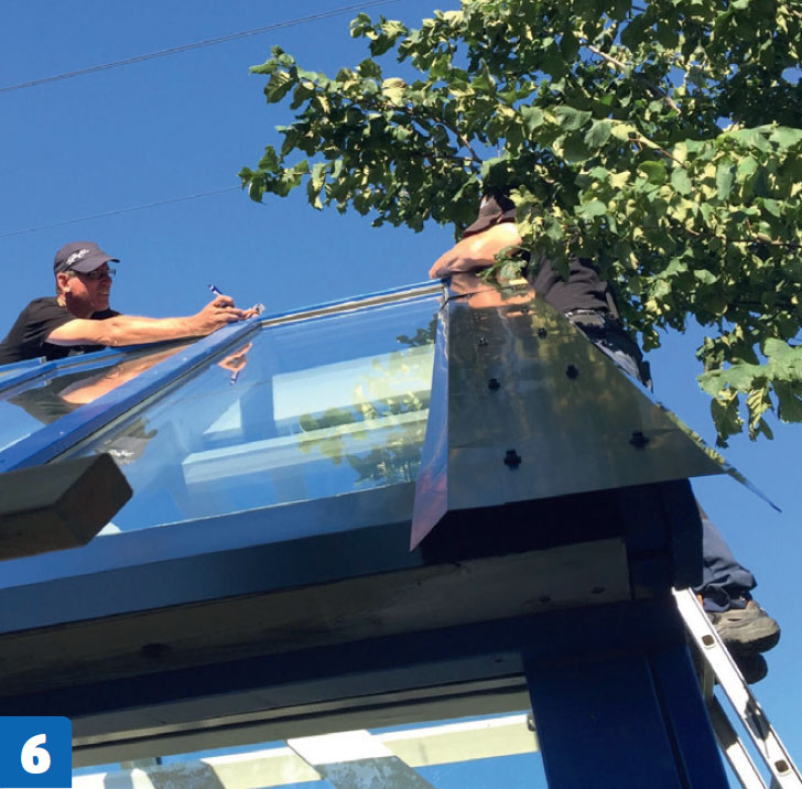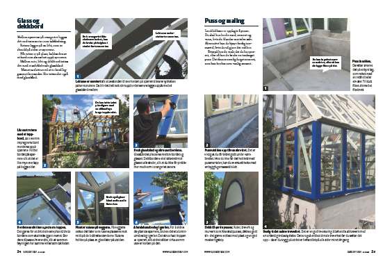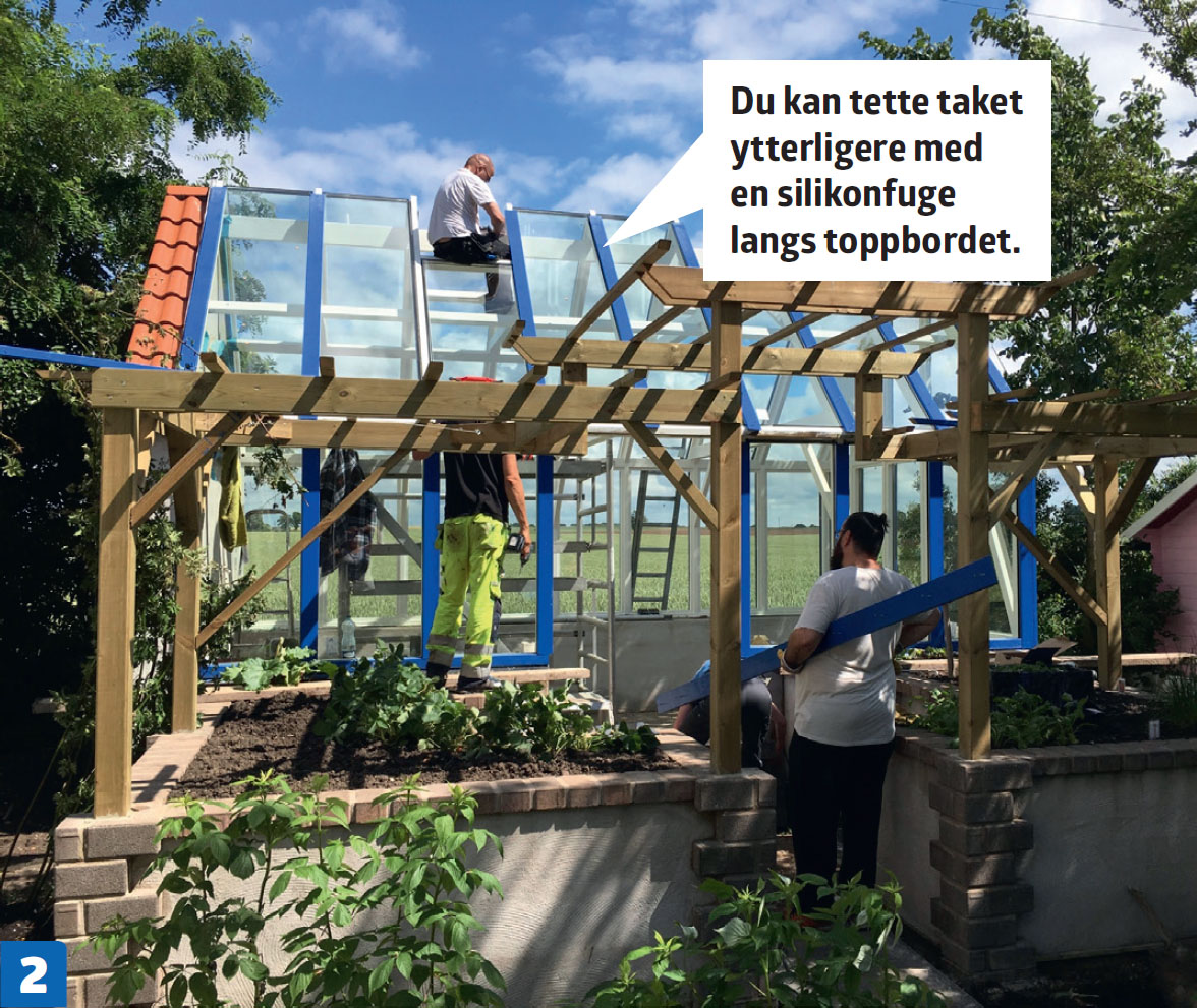 Bruk glassbånd og skru fast bordene. Glassbåndet plasseres mellom bordet og glasset. Dekkbordene skal sitte tett mot glasset alle steder, slik at du ikke får problemer med vann i orangeriet senere.