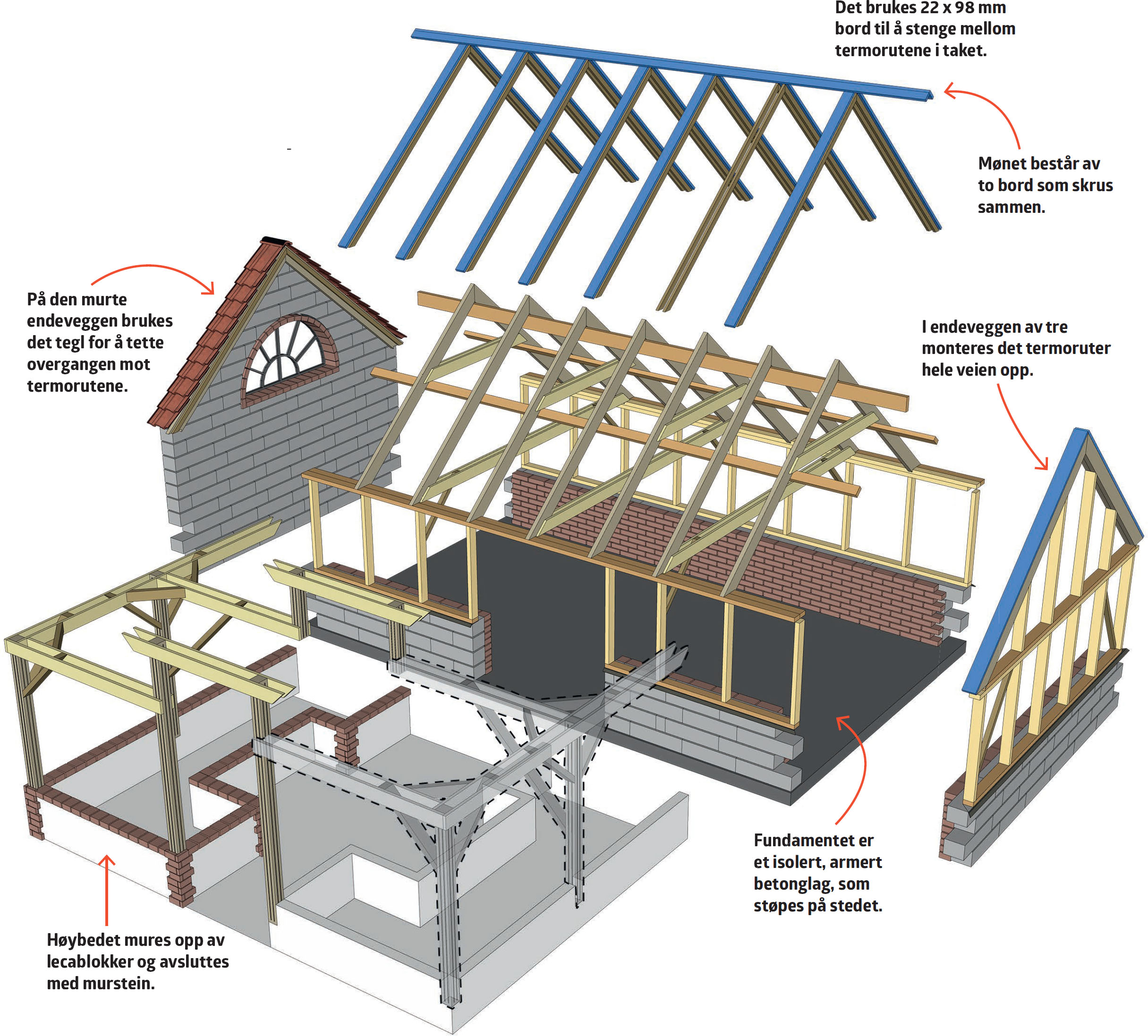 For å få mest mulig takhøyde inne i orangeriet, legges det opp en mønebjelke, som spenner fra endevegg til endevegg. Det gjør det mulig å lage sperrer som hviler på toppsvillen på veggene og mønebjelken i toppen.