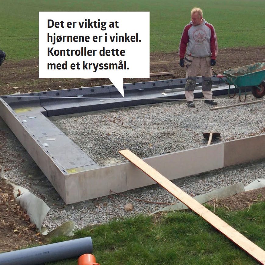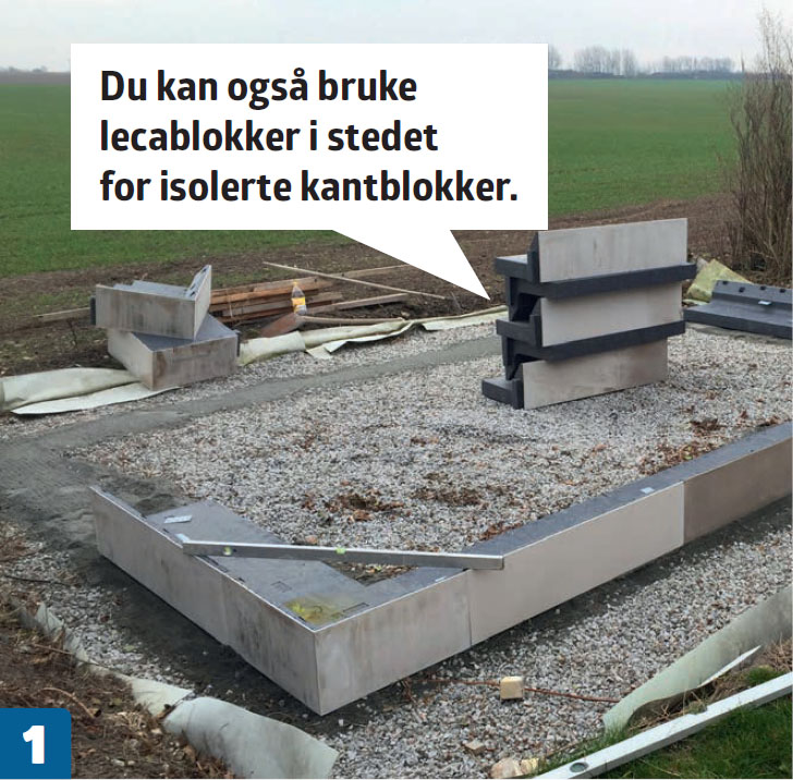 Sett kantblokkene. Her brukes isolerte “L-blokker”, der isolasjon, armering og betong legges over den vannrette delen av blokkene. Sørg for at kantblokkene ligger i vater og vinkel - det er en forutsetning for at resten av bygget skal bli rett, og lettere å sette opp.