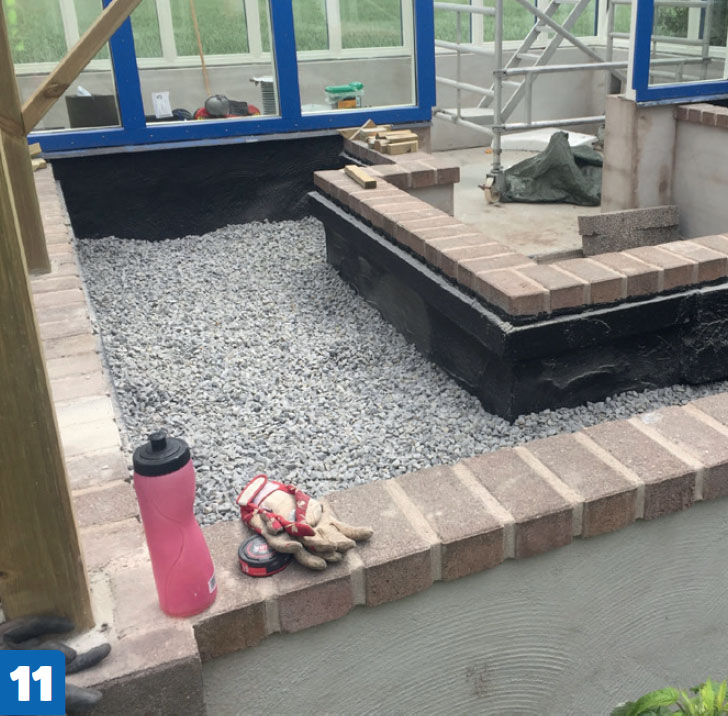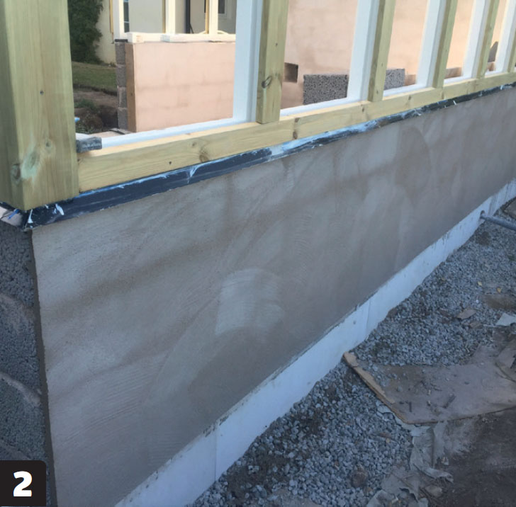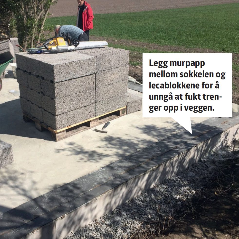 Hold fukten ute. Akkurat som ved fundamentet til orangeriet, skal det også her fuktsikres mellom sokkelen og muren. Igjen gjøres det enkelt med murpapp.