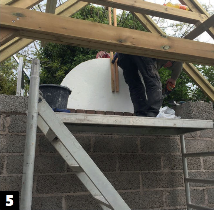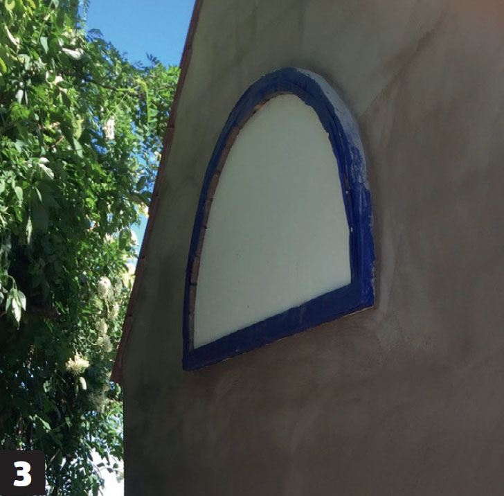 Den ene endeveggen mures opp. Det lages plass til et halvrundt vindu, ved å sette inn en mal av tykk isopor.