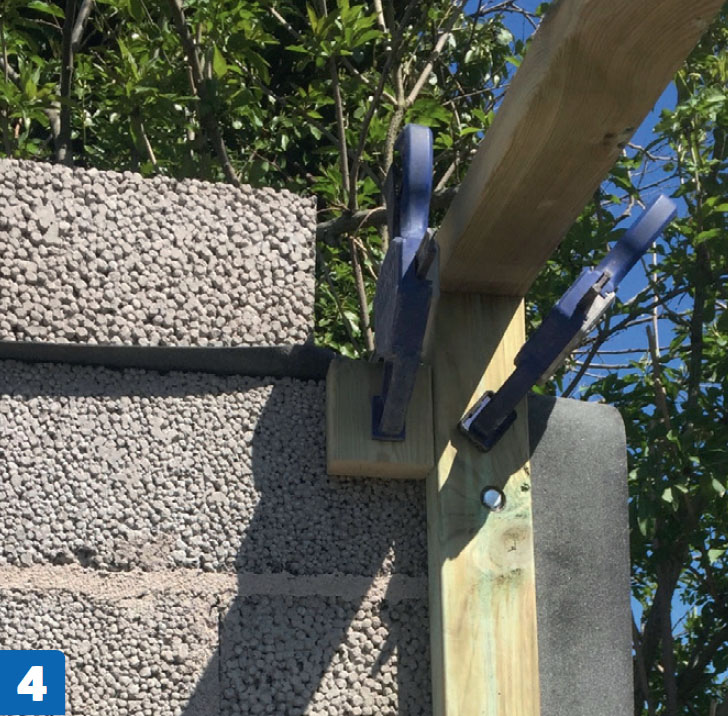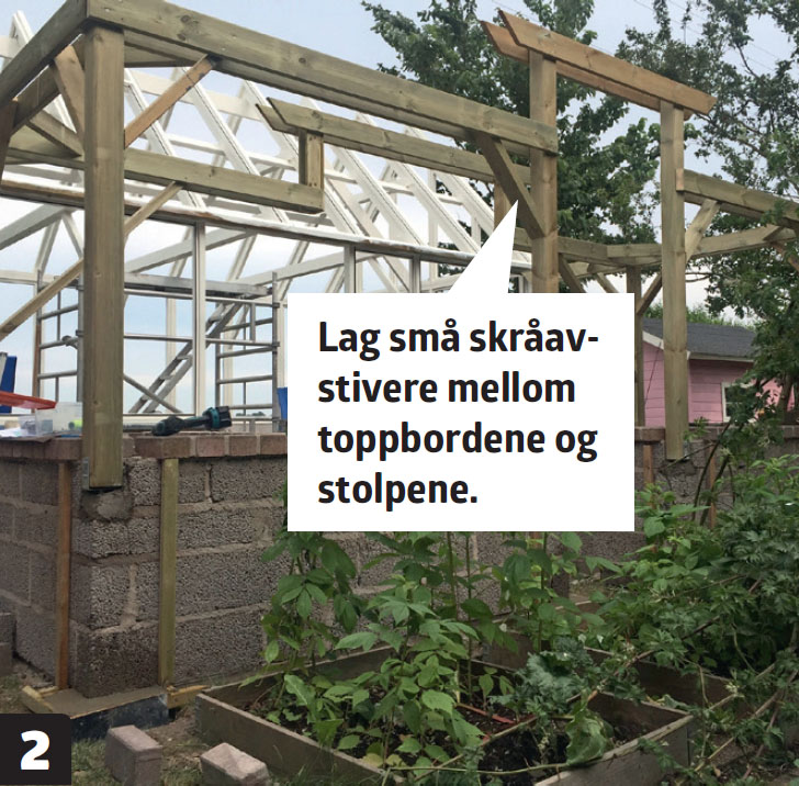 Plasser hjørnestolpene. Det er laget et lite innhakk i lecablokkene på høybedet, som stolpene hviler på. I toppen holdes de av de tverrgående toppbordene.