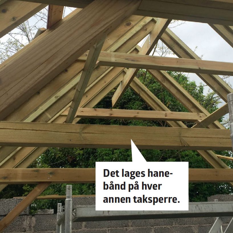 Sett opp hanebånd. Hanebåndene består av to stk. 22 x 148 mm bord. Bordene skrus på hver side av selve sperren, mens mellomrommet som skapes på grunn av sperrenes tykkelse, fylles ut med en tilskåret list.
