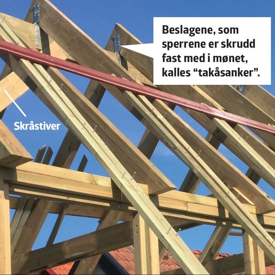 Monter mønebjelken. Bjelken som går fra endevegg til endevegg under taksperrene er mønebjelken. Den understøtter sperrene og reduserer trykket på veggene.
